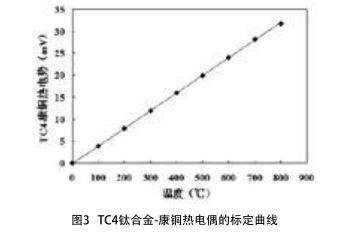 其具體標定過程如下:通過焊臺把鈦合金絲和康銅絲的兩端焊接在一起,一端作為熱電偶的熱端置于箱式電阻爐中進行恒溫加熱,另-端作為熱電偶的冷端置于盛有水的燒杯中(代表室溫)。然后通過改變箱式電阻爐的溫度,測得不同溫度下康銅絲兩端的電動勢,得到鈦合金康銅熱電偶的熱電特性。在冷端室溫為20℃,熱端溫度分別為100℃、200℃、300℃、400℃、500℃、600℃、700℃和800℃條件下,鈦合金-康銅熱電偶標定曲線如圖3所示。