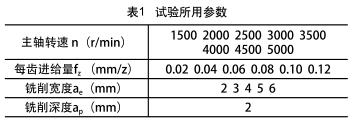 試驗所用的切削參數如表1所示。因為銑削深度ap對銑削溫度影響較小,主要進行了主軸轉速n、每齒進給量fz和銑削寬度ae的單因素試驗。試驗先設定-組基準切削量:n=2000r/min,fz=0.06mm/z,ae=4mm,ap=2mm,在基準切削用量的基礎上,對各切削參數進行單因素試驗,研究各因素對銑削溫度的影響。試驗采用順銑。