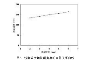 在基準切削用量下,只改變銑削寬度,銑削溫度隨銑削寬度的變化關系曲線如圖6所示。從圖中可得,銑削寬度對銑削溫度的影響同每齒進給量的作用類似,銑削溫度隨銑削寬度的增加而上升,但.上升幅度不大。
