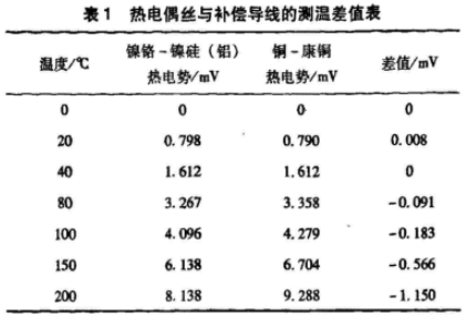 表1是鎳鉻-鎳硅(鋁)熱電偶和補償導線銅一康銅在t0=0℃,t1=0℃~200℃時的熱電偶及它們之間的差值。