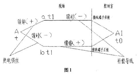 在設備投用前要對多點熱電偶進行系統調試,在系統調試過程中,如果遇到DCS溫度顯示中其中一支熱電偶的測量溫度比實際溫度偏低,首先應考慮接線是否正確。經過現場檢查發現僅熱電偶端補償導線正負極接反,然后將補償導線正確連接,從而消除儀表故障狀態。現在讓我們來具體分析以下補償導線在熱電偶端反接為什么會出現DCS溫度顯示偏低的情況。