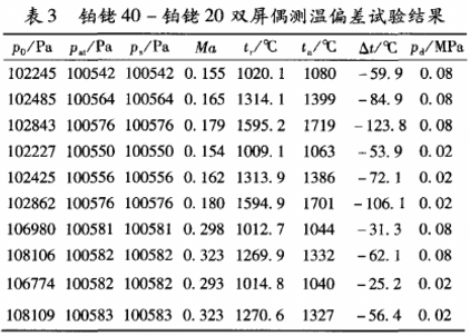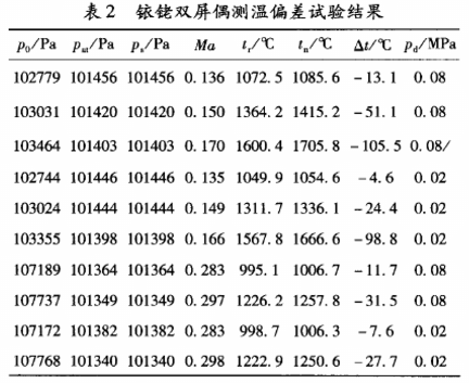 催化溫升的數值一般不具有重復性,所以很難用修正的方法來消除催化效應引起的誤差。影響催化效應的主要是燃氣溫度和氣流速度,在一定的溫度范圍內溫度越高催化效應就越明顯。氣流速度越高,催化溫升也越高。為此,在1700℃熱校準風洞上對設計好的鉑銠、鉑銠40-鉑銠20雙屏偶進行性能考察,將其與原有的B型參考溫度傳感器進行比對研究,分析其在不同溫度、不同速度、不同抽氣壓力、偶絲表面是否鍍膜的測溫偏差,試驗結果如表2~3所示。各表中,Ma為氣流馬赫數;Ps為抽氣壓力;I,為參考溫度(原參考溫度傳感器指示溫度);Po為總壓;pat為大氣壓;p.為靜壓;t0為被測溫度(高溫雙屏偶指示溫度);△t為測溫偏差。