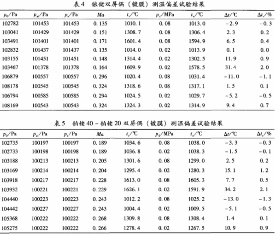 鉑銠雙屏偶與鉑銠40-鉑銠20雙屏偶比參考溫度傳感器指示溫度高是不正常的。分析原因,可能是由,于鉑銠雙屏偶與鉑銠40-鉑銠20雙屏偶是新偶,貴金屬本身存在催化效應,致使指示溫度偏高,可將新偶表面鍍膜,然后再與參考溫度傳感器(舊偶)進行比對試驗。將銥銠雙屏偶、鉑銠40-鉑銠20雙屏偶的外屏、內屏以及偶絲表面進行鍍膜處理后,其測溫偏差試驗結果如表4~5所示。表中,△tr為相對測溫偏差。