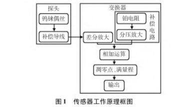 傳感器工作原理如圖1所示,探頭的鎢錸熱電偶絲是將外界溫度信號轉換為微弱的電壓信號,通過補償導線將電壓信號傳遞給變換器。在變換器內部,將探頭的微弱信號進行差分放大。同時,鉑電阻與分壓放大電路組成冷端補償電路,冷端補償電路的輸出與探頭放大后的信號進行加法運算得到精確的溫度信號,再經調零點、滿量程電路輸出滿足要求的標準電壓信號。