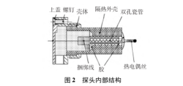 探頭敏感元件為鎢錸熱電偶絲,其固定主要由雙孔瓷管及捆綁線組成,偶絲固定后在殼體中填充919膠再次固定回,填充919膠也可以起到一定隔熱作用。外部隔熱外殼采用耐高溫的鎢鉬合金。