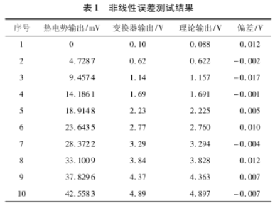 變換器非線性誤差利用信號源代替探頭作為輸入值,鎢錸偶絲在0℃時對應的電動勢為0mV,2700℃時對應的電動勢為42.5583mV,用電壓表測量變換器各點輸出電壓值,記錄數據并擬合曲線,得到傳感器理論輸出值。各測試點測試值見表1..