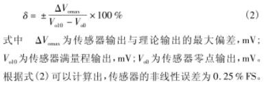 全溫區精度可以根據式(2)推算,全溫區最大偏差為0.734V,可以推算出傳感器精度為1.5%FS.