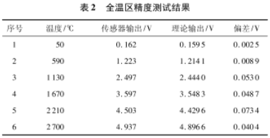 在0~2700℃量程內均勻選取6個溫度點(50,590,1130,I670,2210,2700℃),連接傳感器探頭與變換器,分別測試變換器各點輸出值,并與理論輸出值對比,計算出理論值與輸出值之間的偏差。各測試點測試值見表2。