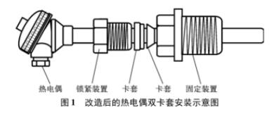 固定螺紋式熱電偶進行結(jié)構(gòu)改造試驗,自制熱電偶專用固定裝置,實施后效果良好。特殊改造后的固定裝置,具有現(xiàn)場更換方便、可重復(fù)使用、使用壽命長、實用性強等優(yōu)點,同時提高了儀表-線維護人員的作業(yè)效率。安全檢修專用固定裝置主要包括.φ20mm活動錐形雙卡套密封組件和外螺紋固定接頭。根據(jù)熱電偶不同的直徑,可調(diào)整活動卡套的大小及固定螺紋的規(guī)格尺寸,其外形結(jié)構(gòu)簡圖見圖1.