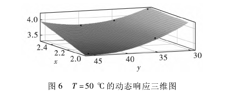 根據試驗得出的數據,建立了在不同溫度下,基于PT100的不同尺寸的動態響應數學模型。文中選取溫度為50℃時的數學模型進行展示,動態響應三維圖如圖6所示。