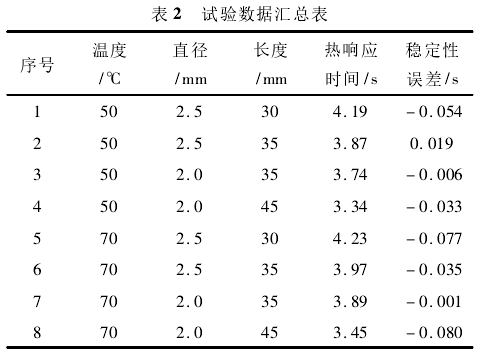 式(10)反映出該模型在被測溫度為50℃時,傳感器的直徑與長度對其熱響應時間的影響。其中傳感器的長度對其熱響應時間的變化影響更大,而直徑對其變化影響比較小。