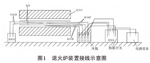 將直徑20mm的瓷管放在退火爐爐內,用兩支標準偶分別作為移動偶和監控偶。移動偶從爐子的一側放人爐中心軸線上,監控偶放在瓷管與爐管之間,測量端分別處于爐中心截面的徑向上,監控偶監視爐溫變化。移動偶和監控偶的參考端分別與導線的一-端連接放人冰點恒溫器內,導線的另一端與轉換開關連接,再用測量線連接電測儀器(見圖1)。控溫偶.從爐子的另一側放人爐內中心軸線上,測量端處于爐中心,參考端與控溫儀表相連。