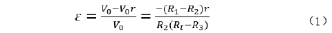 三線式Pt1000不平衡電橋如圖1,R1/R2/R3為固定電阻,r1,/r2/r3為熱電阻導(dǎo)線內(nèi)阻,Rt為熱電阻,Vr為導(dǎo)線內(nèi)阻電壓,V為電橋電源,V0為理想狀態(tài)下電橋電壓,Vr為內(nèi)阻存在時橋電壓。