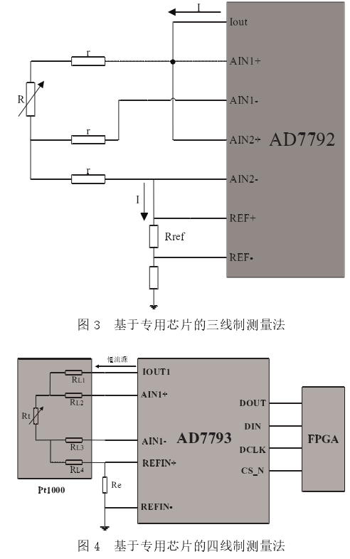 常用熱電阻測溫電路有利用串聯(lián)精度高電阻分壓的方式,經(jīng)過運(yùn)算放大和跟隨后采集,這種方法結(jié)構(gòu)簡單、成本低,但是測量誤差較大;電橋法測電阻精度高,但是結(jié)構(gòu)復(fù)雜,需要大量計算;三線制恒流源法利用外部恒流源驅(qū)動熱電阻,經(jīng)過運(yùn)放調(diào)理電路后進(jìn)行采集,這種方法結(jié)構(gòu)簡單,測量精度高,但是無法避免熱電阻導(dǎo)線內(nèi)阻和恒流源波動產(chǎn)生的影響;文獻(xiàn)采樣芯片使用外部參考電壓,可以消除電源波動影響,降低熱電阻導(dǎo)線內(nèi)阻影響,但是當(dāng)導(dǎo)線內(nèi)阻阻值不同時,無法完全消除內(nèi)阻影響。基于專用芯片采用四線制熱電阻進(jìn)行溫度測量,在消除恒流源波動影響的同時,可以完全消除熱電阻內(nèi)阻帶來的測量誤差,進(jìn)一步提高測量精度。