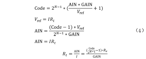 上式中,Code為AD讀取的采樣值,N為AD芯片位數(shù),AIN為待測熱電阻電壓值,GAIN為芯片增益值,Vref是外部基準(zhǔn)電壓,即Re電阻的電壓值。AD采樣芯片外部參考電壓為4.5V,熱電阻兩側(cè)待測電壓最大值為4.21V,即增益值GAIN設(shè)置為1。由R,的表達(dá)式可以得出,電流源波動誤差通過使用外部基準(zhǔn)電壓設(shè)計,可以完全消除,同時也完全消除熱電阻導(dǎo)線內(nèi)阻影響,熱電阻阻值測量誤差最終只與電阻R。的精度和AD7793芯片性能有關(guān)。