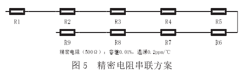 由Rt最終計算公式可知,通過降低Re本身誤差可以保證系統(tǒng)測量精度。Rt熱電阻電壓變化范圍為2V~4.2103V,則AD芯片參考電壓設(shè)計為4.5V時滿足系統(tǒng)測量要求,即電阻Re的值確定為4.5kΩ。將9個容差為0.01%,溫漂為0.2ppm/℃的500Ω電阻串聯(lián),可以有效地降低Re誤差,如圖5所示。