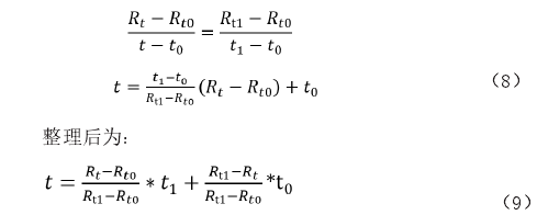 Rt為測量熱電阻阻值,Rto.Rt1為Rt在查找表內(nèi)相鄰的兩個熱電阻阻值,t0、t1為查找表中Rt0.Rt1對應(yīng)的溫度: