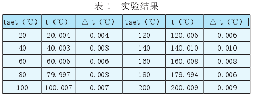 為了驗證測量精度是否改善,將Pt1000熱電阻放置恒溫箱中一段時間,待溫度穩(wěn)定后,將測量溫度與恒溫箱設(shè)定溫度進(jìn)行對比。測量不同溫度,測量結(jié)果如表1。表中tset為恒溫箱設(shè)定溫度,t為測得的溫度,△t為誤差值。
