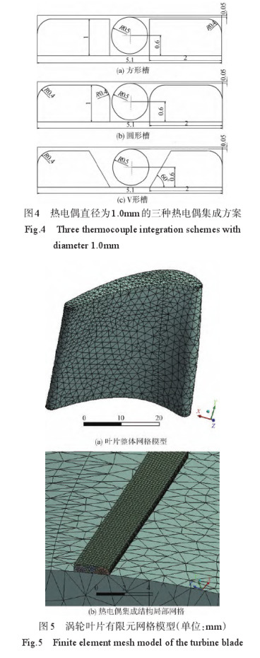 鎧裝熱電偶。選用不同的熱電偶結構,相應的增材制造結構尺寸將發生改變,另外增材制造部分與噴涂部分可選擇不同的接觸形式,包括方形槽、圓形槽和V形槽。對于噴涂部分,需確保在離心力作用下熱電偶能可靠放置于槽內,其噴涂厚度存在多種選擇。綜上所述,基于激光增材制造及超聲速火焰噴涂技術的熱電偶集成結構存在多種組合形式,圖3為熱電偶直徑為0.5mm、涂層厚度為0.05mm的幾種熱電偶集成方案,圖4為熱電偶直徑為1.0mm、涂層厚度為0.05mm的幾種熱電偶集成方案;另外,基于直徑1.0mm的熱電偶方形槽集成方案,將涂層厚度分別設置為0.050mm、0.075mm、0.085mm、0.100mm共4種形式以研究涂層厚度對集成方案強度的影響。忽略氣動效率、加工成本等方面的影響,熱電偶集成方案的可行性主要在于各組件結合面強度滿足設計要求,以確保在使用過中渦輪葉片安全可靠運轉。將對前述的幾種熱電偶集成方案進行有限元仿真,對各組件結合面應力進行對比分析。
