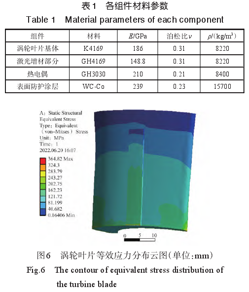 仿真時在葉片根部施加位移約束;葉盤全局施加轉速21000r/min。圖6為方形槽集成結構下葉片Von-Mises等效應力分布云圖,含熱電偶集成結構的葉片與其余葉片整體應力分布-.致,即熱電偶集成結構的存在并未對渦輪葉片應力分布產生影響,表明基于LDM和HVOF的熱電偶集成方法具有不改變葉片原有結構強度的優點。