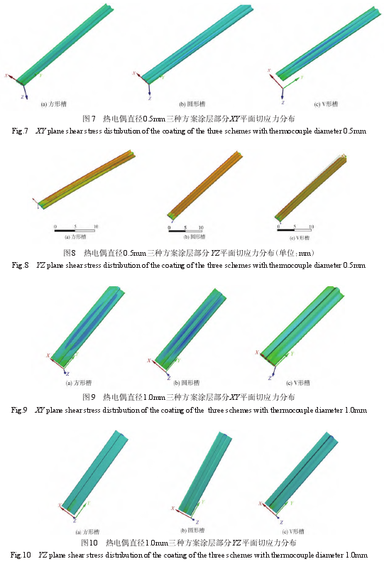 在熱電偶直徑為0.5mm的三種集成方案中,V形槽結構下增材部分和涂層部分的XY平面的切應力均小于圓形槽和方形槽方案,但YZ平面的切應力相對較大。
