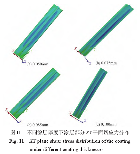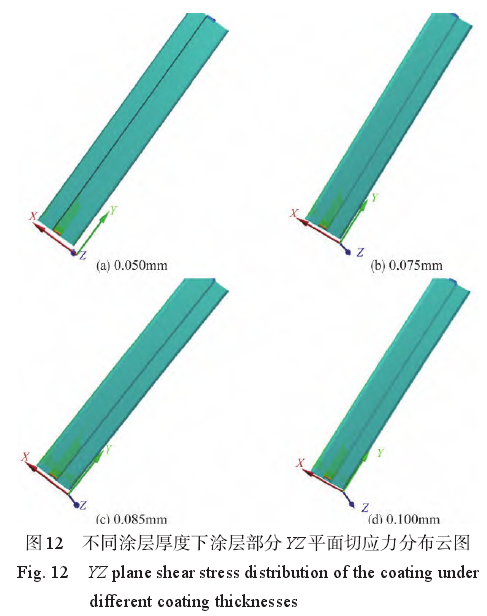 可見,涂層厚度對涂層部分XY平面切應力的影響較小,且未見明顯規律,可忽略。涂層厚度對涂層結構Yz平面切應力存在影響,隨著涂層厚度的增加,YZ平面最大切應力增加,但增加量較小。