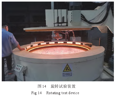 按照該方案進行渦輪葉片熱電偶集成,如圖13所示。通過高速旋轉試驗來對集成熱電偶的渦輪轉子的強度進行最終驗證14,將渦輪盤和旋轉工裝裝配在試驗臺上,如圖14所示,對渦輪轉子和熱電偶進行外觀檢查,對超轉試驗臺進行檢查,確認完好開展試驗。試驗轉速從0緩慢增加到21000r/min,保持5min,試驗全程實時監控試驗臺振動、溫度和其他工作參數。
