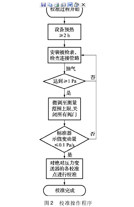 首先將被校變送器正確安裝,位置如圖1所示。關閉微調閥和放氣閥后,打開真空泵及其連接管路.上的真空閥,對傳感器安裝接口及真空氣室進行抽氣,當真空顯示控制單元顯示的壓力值達到1Pa左右時,逐步打開微調閥,使氣瓶內的氣體通過微調閥進入真空氣室,通過平衡抽氣和氣瓶補氣達到動態的平衡后,真空顯示控制器的顯示值達到預定的校準壓力值時,讀取被校變送器示值,完成校準后,關閉真空泵及真空泵后的真空閥,關閉氣瓶和同時關閉真空氣室的微調閥后,打開放氣閥,待壓力達到大氣壓時,卸下變送器,校準結束。操作流程如圖2所示。