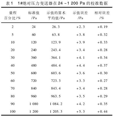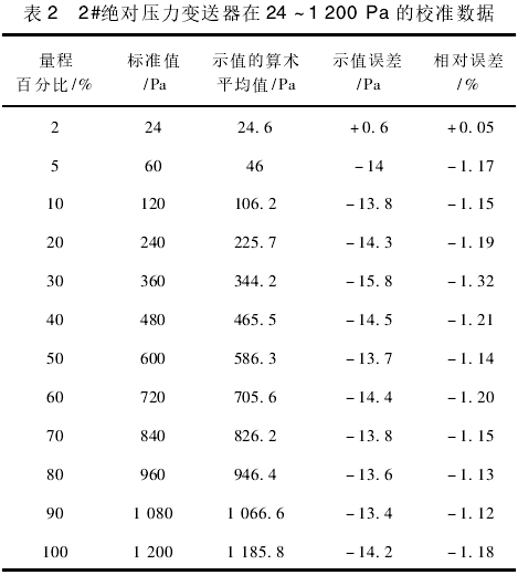 根據校準操作程序和計算方法,隨機抽取2臺在使用的不同廠商的絕對壓力變送器進行校準,測量范圍設定為0~1200Pa,為驗證變送器實際計量性能,根據JJG882--2004的要求,選擇的校準范圍為24~1200Pa。
