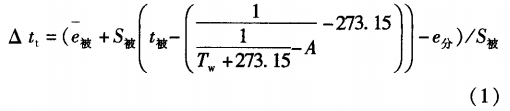 式中:A為石英玻璃透過率;Tw為帶玻璃窗口標準所測溫度值,C;`e被為被校熱電偶在校準溫度點附近測得的熱電動勢算術平均值,mV;S敏為被校熱電偶在校準溫度點的微分熱電動勢,mV/℃;t被為校準溫度點,℃;e分為被校熱電偶分度表上查得的校準溫度點的熱電動勢值,mV;△t