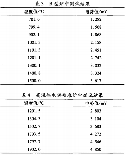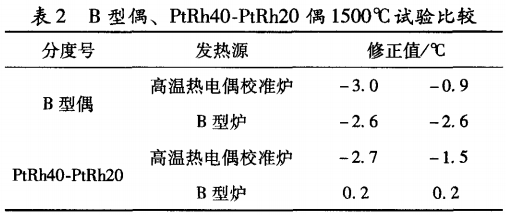 鉑銠40-鉑銠20熱電偶放置在B型爐中測試,以二等標準B型偶為標準,得到1300~1500℃范圍段的電勢值以及修正值。同樣,將兩種類型熱電偶放在高溫檢定爐中校準,分別比較二支偶在1500℃下的差值,如表2所示。