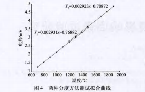 將測試數據進行線性擬合分析,可以看出,兩種分度方法擬合曲線基本吻合,在1000℃和2100℃時均相差0.06℃,線性度良好。