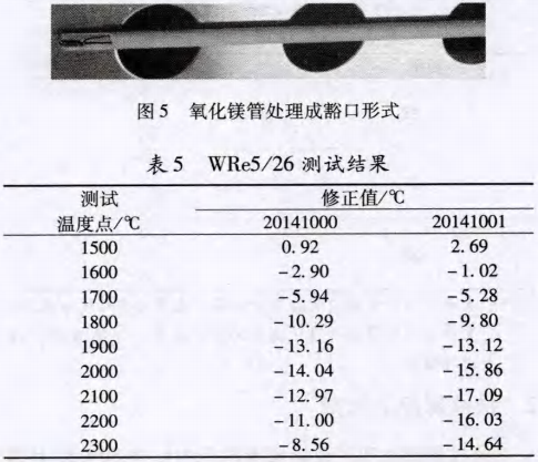 試驗所采用的兩支WRe5/26偶絲來自同一型號、同批次,給出的最大允差為±1%t。實驗前在真空手套箱內進行封裝,絕緣材料為氧化鎂,保護管為ψ6鎢管。由于鎢錸偶絲與水分在高溫下容易發生化學反,應,且氧化鎂經燒結后在室溫下易吸收水分,為減小水分的影響,氧化鎂材料使用前在200℃烘箱烘2h后密封保存。同時為避免測量端與鎢管底部接觸現象,在鎢管內預先放置2mm氧化鎂粉末,且氧化鎂末端處理成豁口形式,如圖5所示。其余實驗條件相同,測試結果如表5所示。