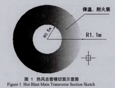 熱風總管外徑2.2m,由外而內鋪砌針剌纖維毯(保溫層)、輕質磚(保溫層)、高鋁磚(耐火層),耐火保溫層總厚度0.6m,流通直徑1.0m(半徑0.5.m),如圖1所示。