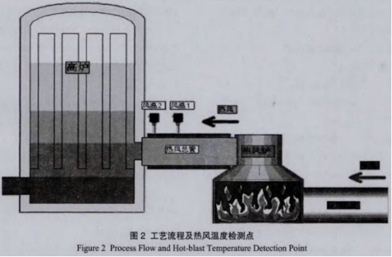1)玉鋼煉鐵高爐熱風總管的熱風為素流流體,對管道中的熱風測量溫度時,可采用淺插式熱電偶安裝方式。熱電偶的插人深度選擇在0.8m可以準確地測量出熱風的溫度。