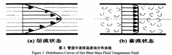 根據計算結果,玉鋼煉鐵高爐熱風總管雷諾數遠遠高于臨界值(2200),流體的流動為紊流狀態。因此,理論上,只需將熱電偶的熱點插人流體的等溫區就可以準確地測量出流體的溫度,而插人深度完全無需達到管道的中心。
