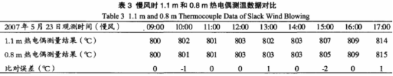從表1、表2的實驗結果可看出,正常生產時,1.1m熱電偶的測溫結果與0.7m熱電偶的測溫幾乎相同,但在高爐生產不順而慢風時,0.7m熱電偶在慢風狀態下測量溫度有一-定的誤差。為此更換成0.8m熱電偶,在風溫1用1.1m熱電偶,風溫2用0.8m熱電偶進行測溫實驗,其實驗結果如表3所示。
