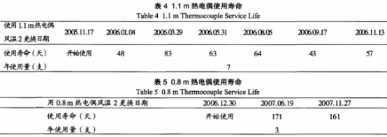 如表4,表5所示,改進后熱電偶的使用壽命由1~2個月提高到了5~6個月。取得了明顯效果。并且選用0.8m熱電偶進行熱風溫度的測量,熱電偶購買成本每支可降低約3100.00元人民幣。
