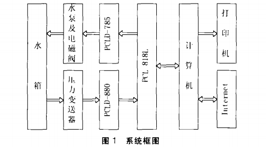 水位控制系統(tǒng),是利用安裝在罐底的兩個(gè)擴(kuò)散硅壓力變送器對(duì)兩個(gè)水罐的水位進(jìn)行實(shí)時(shí)檢測(cè),然后將被測(cè)的1~5V標(biāo)準(zhǔn)信號(hào)經(jīng)A/D轉(zhuǎn)換后輸人計(jì)算機(jī),根據(jù)采集到的信號(hào)情況,計(jì)算機(jī)將控制信號(hào)經(jīng)D/A轉(zhuǎn)換后輸出給執(zhí)行機(jī)構(gòu),對(duì)水泵、調(diào)節(jié)閥、出水閥進(jìn)行上述的控制,從而形成計(jì)算機(jī)控制的閉環(huán)控制方案。其系統(tǒng)組成如圖1所示。