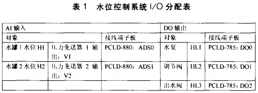 圖1中,由于有兩路模擬量輸人(AI),三路開關(guān)量輸出(DO),因此I/O接口設(shè)備選用研祥PCL--818L多功能板卡,該卡有16路模擬量輸人,輸人模擬電壓范圍-10~+10V,1路模擬量輸出(最大±10V),16路數(shù)字量輸人(DI)和16數(shù)字量輸出(DO),TTUDTL電平兼容。為了便于對(duì)象與PCL--818L多功能板卡之間接線,同時(shí)選用相應(yīng)的接線端子板,DO通道選用16路繼電器輸出端子板PCLD-785,該端子板輸出觸點(diǎn)負(fù)載為DC:30V/1A,AC:120V/0.5A,完全滿足水泵和電磁閥的需要。Al通道選用PCLD-880端子板。
