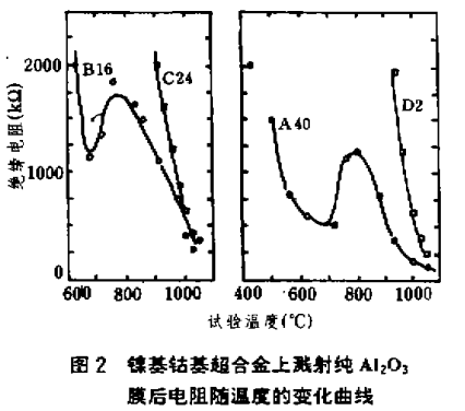 關(guān)鍵試驗(yàn)是測(cè)定一定溫度下氧化物層的電阻值,圖2給出了部分試驗(yàn)結(jié)果,所有樣品的熱氧化物層上都濺射了不小于1μm厚度的純AlgO3層。圖中C24和D2樣品1000°C時(shí)仍保留有足夠的電阻值(>200kΩ)。C24和D2樣品是鈷基超合金MARM509上電子束蒸鍍NiCoCrAIY涂層,A40和B16樣品是在鎳基超合金MARM200+H{上蒸鍍FeCrAlY。兩種樣品濺射純Al2O;后1000°C時(shí)都保持足夠的絕緣電阻且均呈現(xiàn)出自恢復(fù)趨勢(shì),如圖2所示。值得注意的是薄膜熱電偶的輸出值只有熱電合金預(yù)計(jì)輸出值的83%。