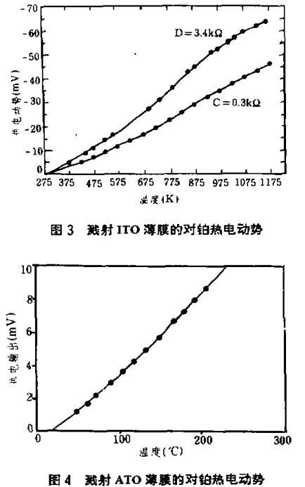 用銻錫氧化物進(jìn)行試驗(yàn)也得到類似結(jié)果。采用純銻和純錫雙靶制造出低阻率ATO透明膜,沉積溫度為320℃,氣氛為0.4Pa的氬氧混合氣.其中氬和氧各50%。ATO膜厚為0.3~0.4μm,電阻率為2.4X10-*0cm.圖4給出了ATO膜的對(duì)鉑熱電勢(shì)典型曲線。通過控制ATO和ITO膜的電阻率,可以制成測(cè)溫精度為0.2K的薄膜熱電偶。目前,ATO和ITO薄膜熱電偶已進(jìn)人商業(yè)實(shí)用化階段。