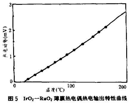 在氧化鋁基片上反應(yīng)濺射沉積生成光滑無氣孔的RuO2和IrO2薄膜,通過對(duì)濺射膜.進(jìn)行不同工藝的熱處理,可以在室溫至180℃范圍內(nèi)得到不同的塞貝克系數(shù),RuO2為4~12μV/°C,1rO2為7~17μV/°C.室溫下沉積的RuO;膜粒度極細(xì),呈非晶態(tài),溫度高于420°C后回火會(huì)產(chǎn)生再結(jié)晶,這種再結(jié)晶體具有標(biāo)準(zhǔn)的金紅石結(jié)構(gòu)。同樣室溫下沉積的IrO2也是顆粒極細(xì)的非晶態(tài),420°C以上回火后也呈金紅石結(jié)構(gòu)。1rO2在700°C回火可獲得最小的塞貝克系數(shù)(7pV/°C),而在200℃或更低的溫度下回火,塞貝克系數(shù)為12~14pV/°C.圖5給出了200°C回火后IrO2-RuO2薄膜熱電偶的熱電動(dòng)勢(shì)曲線,熱電動(dòng)勢(shì)和溫度幾乎呈線性關(guān)系(μV==1.8T+5.5X10