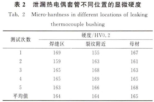 熱電偶套管焊接質量直接影響其耐蝕性。采用維氏硬度計對開裂熱電偶套管母材區、裂紋附近和焊縫區的顯微硬度進行測試,判斷是否存在加工硬化。如表2所示,泄漏熱電偶套管焊縫區、裂紋區和母材區的平均顯微硬度分別為164HV、164HV和165HV,硬度均小于200HV,無明顯的加工硬化現象。熱電偶套管與換熱器殼體的焊接方式也會對其耐蝕性產生影響[24],如某公司合成氨裝置氣化爐,其熱電偶套管材質與爐體材料相同,均為SCMV3鋼(相當于11/4Cr-1/2Mo鋼)。大修期間發現氣化爐內壁熱電偶套管與爐體焊縫熱影響區產生兩條裂紋。通過焊前消氫處理,焊接時選用適當的焊絲及控制焊接參數,焊后高溫回火熱處理,對裂紋進行了補焊修復[25]。奧氏體不銹鋼不宜在敏化溫度范圍內停留太長時間,否則容易產生熱裂紋。因此,應嚴格控制熱電偶套管的焊接工藝。