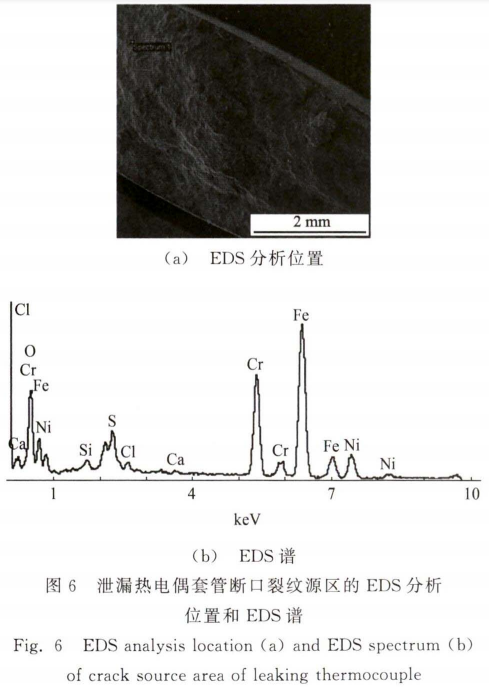 采用PhilipsQuanta200型掃描電子顯微鏡(SEM)對泄漏熱電偶套管斷口進行微觀形貌觀察,并采用能譜儀(EDS)對斷口微區的化學成分進行分析。如圖4(a)所示,泄漏熱電偶套管斷口表面分布著大量泥紋狀的腐蝕產物,可觀察到局部區域存在二次裂紋,該形貌特征是應力腐蝕開裂的典型形貌特征,進一步確定了該熱電偶套管的開裂形式為應力腐蝕開裂。如圖4(b)所示,在泄漏熱電偶套管斷口最終斷裂區,腐蝕產物相對較少,但表面依然有少量腐蝕產物覆蓋,說明管道內介質對不銹鋼的腐蝕較為嚴重,在應力和腐蝕性介質的共同作用下,裂紋貫穿管壁,最終導致套管發生泄漏。如圖5所示,去.除腐蝕產物后泄漏熱電偶套管斷口最終斷裂區呈韌窩狀,說明母材的塑性良好,這進一步證明了該泄漏熱電偶套管的斷裂原因為應力腐蝕開裂。