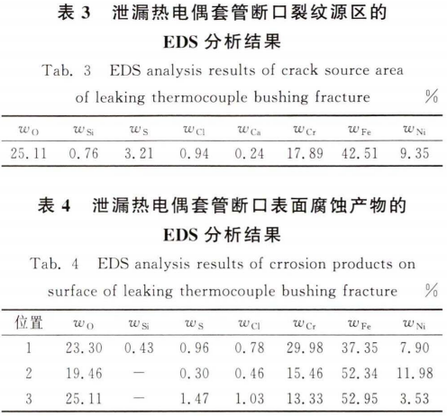 選擇泄漏熱電偶套管斷口裂紋源區尺寸為0.5mmX0.31mm的一個微區進行面掃描,EDS分析結果如圖6和表3所示。由圖6和表3可知,斷口表面腐蝕產物中含有Fe、Cr、Ni,O、Cl.S等元素,其成分主要為鐵、鉻和鎳的氧化物。值得注意的是,斷口表面腐蝕產物中含3.21%(質量分數)S和0.94%(質量分數)CI,可進--步確定該熱電偶套管泄漏的原因是熱影響區和母材的表面狀態和顯微組織的差異,在熱影響區優先產生應力,形成裂紋,硫化氫和氯化物共同作用導致裂紋處發生應力腐蝕開裂,裂紋從熱影響區向母材區逐漸擴展,從而導致該熱電偶套管發生泄漏。在斷口表面選取三個典型的位置,對其表面的腐蝕產物進行EDS分析,結果如表4所示,斷口表面上布滿泥狀腐蝕產物,腐蝕產物的主要成分也是鐵、鉻和鎳的氧化物,S和CI元素的存在也證實了套管開裂的主要原因為硫化氫和氯化物共同作用,導致熱影響區產生的裂紋進--步向母材區擴展,從而造成了應力腐蝕開裂。