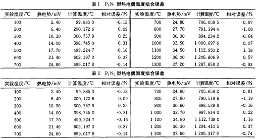 用計算機模擬計算可求得β0~βn。但在實際測量時,都是由測得的熱電勢E(T)求得溫度T,況且從圖2、圖3、圖4的特性曲線上看出,在不同的溫度區(qū)間內(nèi),非線性程度不同,為此采用最小二乘法進行折線分段擬合,根據(jù)石墨纖維熱電偶的輸出特性,將100C~1300℃范圍分成兩個段,擬合公式如下: