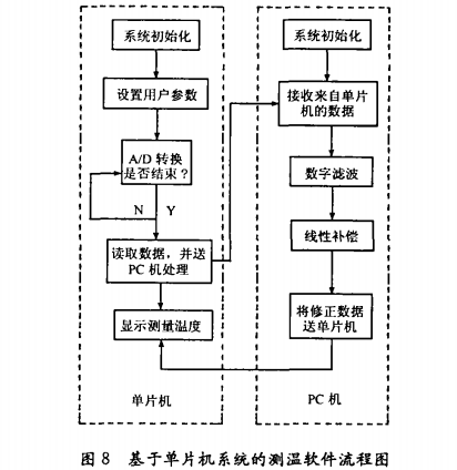 測試系統(tǒng)的軟件主要完成對信號的采集、處理、數(shù)據(jù)傳輸、信息輸入與溫度顯示等功能,見圖8。它由兩部分組成:單片機部分主要完成信號的采集、系統(tǒng)的外部接口、控制功能;主要包括A/D采集和轉(zhuǎn)換模塊、D/A轉(zhuǎn)換模塊、顯示模塊以及鍵盤輸人處理模塊。PC機部分則將單片機傳送來的各種數(shù)據(jù)通過一系列修正模型計算出溫度,然后將結(jié)果返回給單片機。這樣將原本由一個單片機處理需要花費很長時間的數(shù)學(xué)模型計算交給PC機,讓二者各取所長,使得整個系統(tǒng)計算溫度的速度大大提高,提高了測溫儀的實時響應(yīng)特性。為了便于溫度的實時監(jiān)測,將A/D轉(zhuǎn)換器設(shè)置為連續(xù)轉(zhuǎn)換方式,系統(tǒng)軟件主體流程如圖8所示。