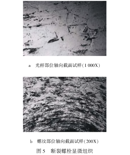 由圖5a可見:光桿部位的金相組織為奧氏體及夾雜物,沿晶界析出少量碳化物;由圖5b可見:螺紋部位呈帶狀金相組織。