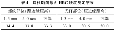 由表4結(jié)果可知:螺栓的硬度由邊緣向芯部逐漸降低,而光桿部位芯部硬度低于螺紋部位。
